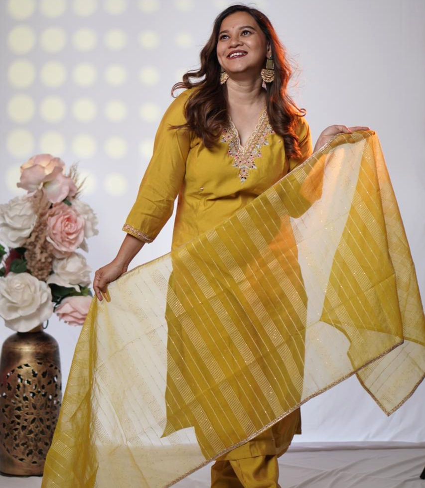 This vibrant mustard yellow outfit, Cotton Silk Fabric, with soft embroidery and a flowy dupatta has a bright, confident, and festive vibe. It blends richness with grace — ideal for haldi, daytime functions, or a statement summer wardrobe.