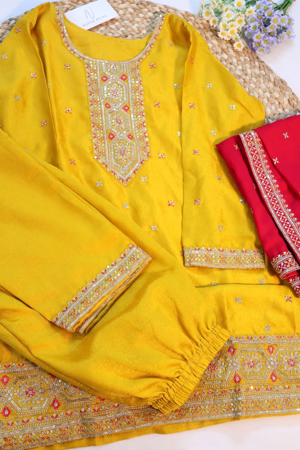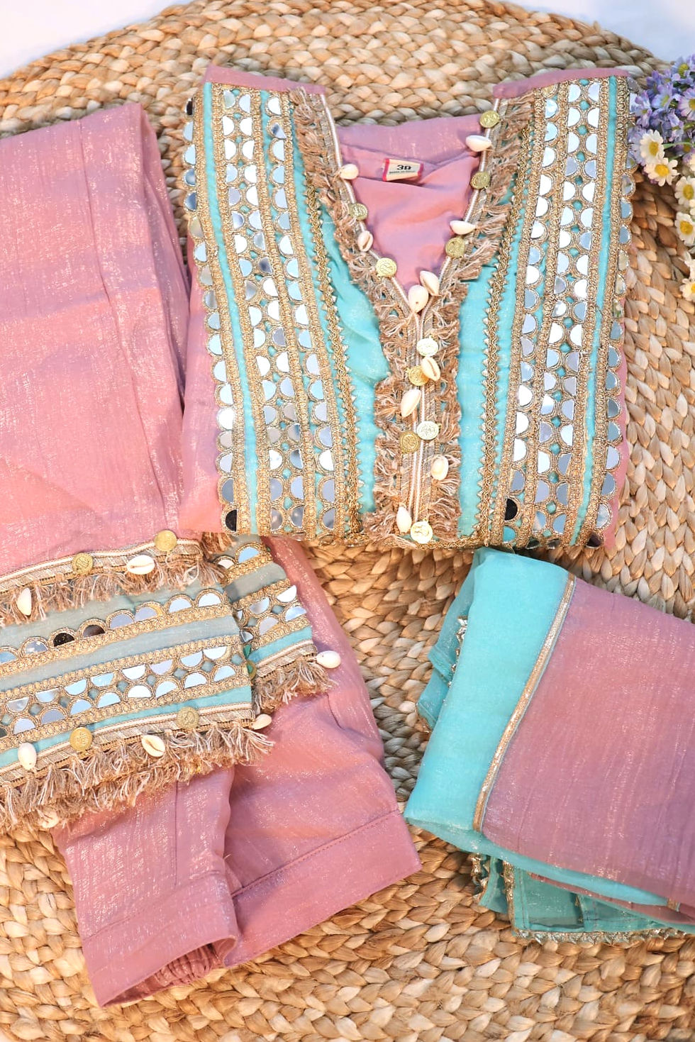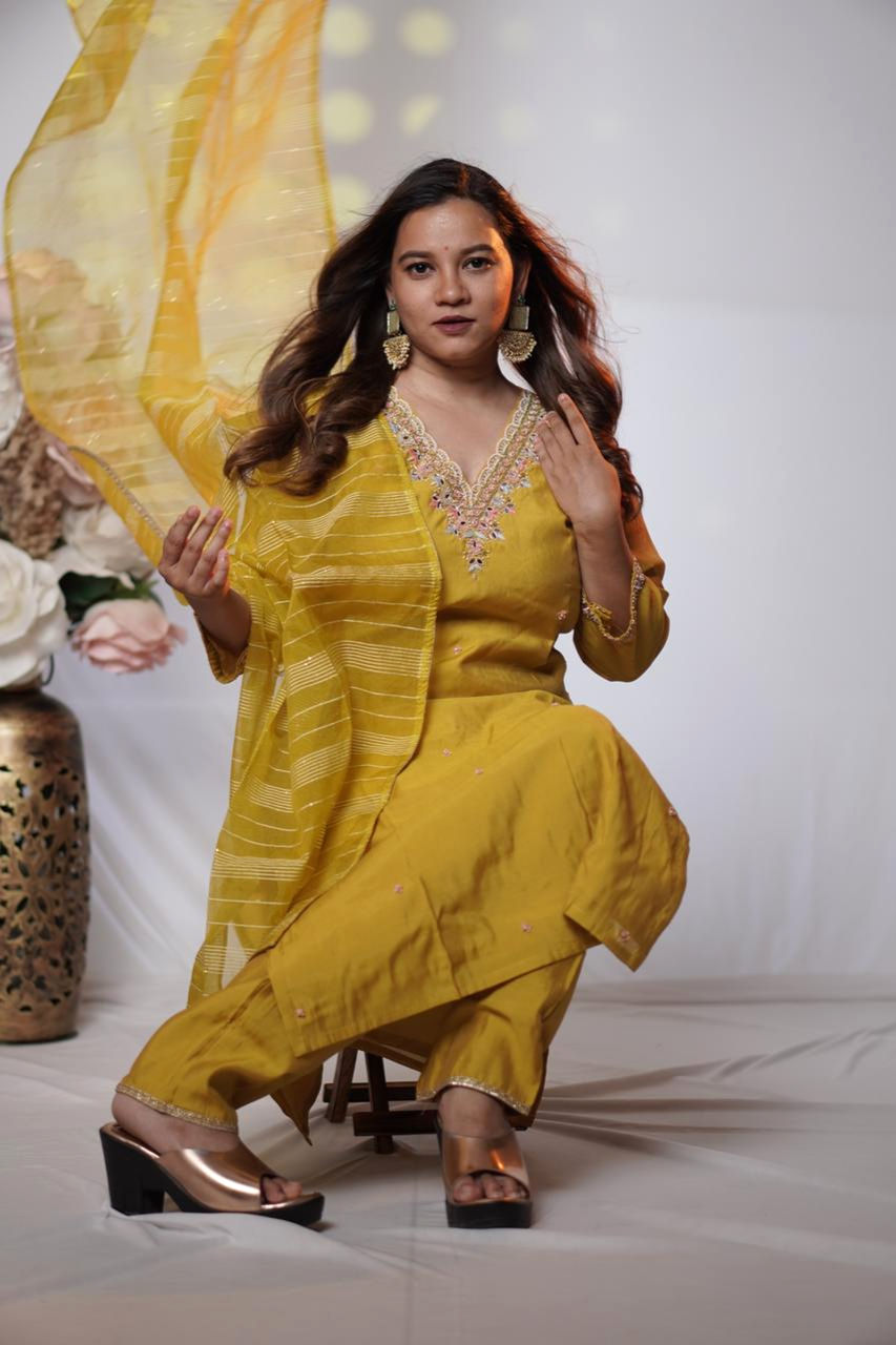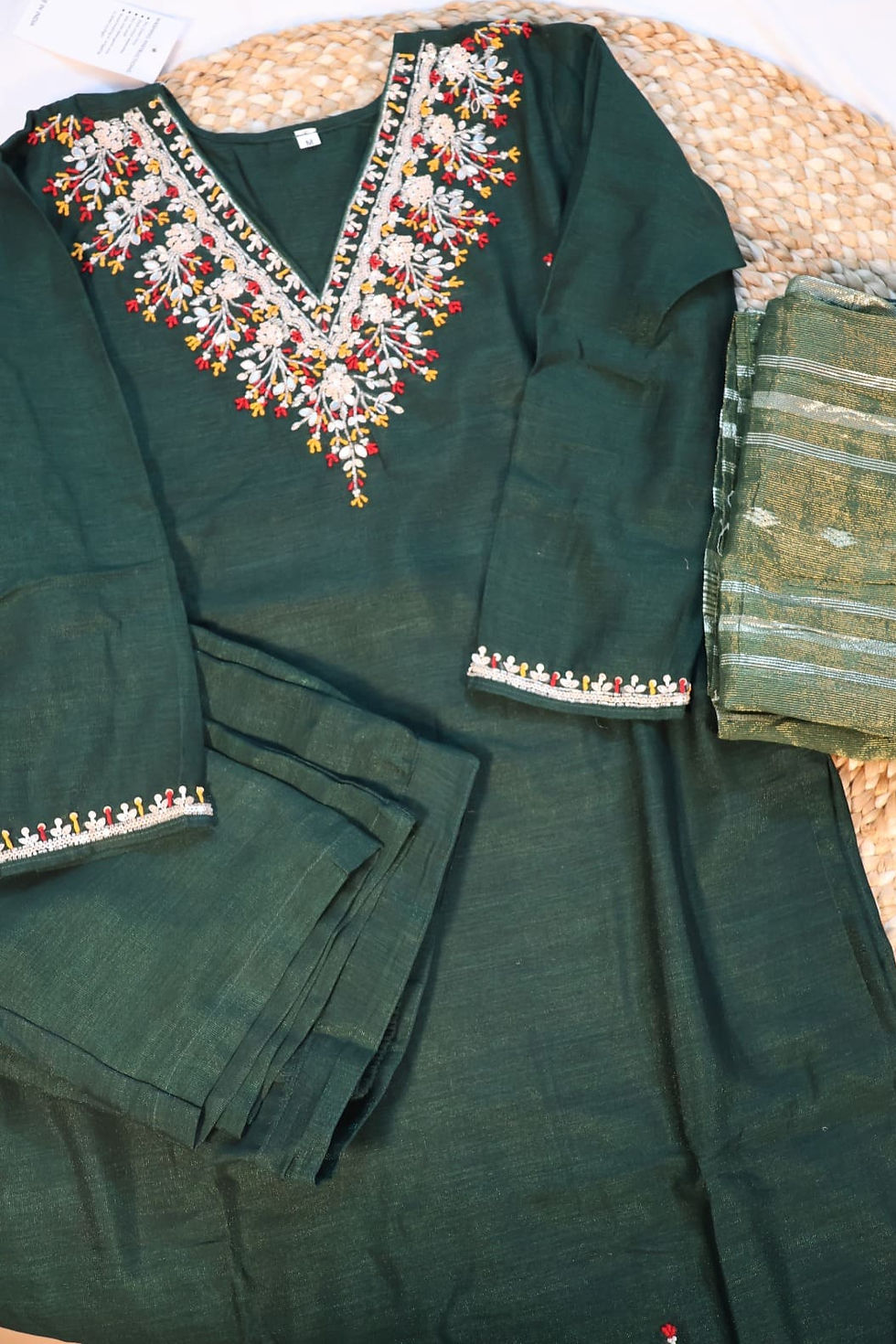 A rich deep green outfit adorned with delicate embroidery and subtle sequin detailing. Its elegant shimmer and timeless silhouette make it a perfect choice for evening celebrations or festive gatherings.